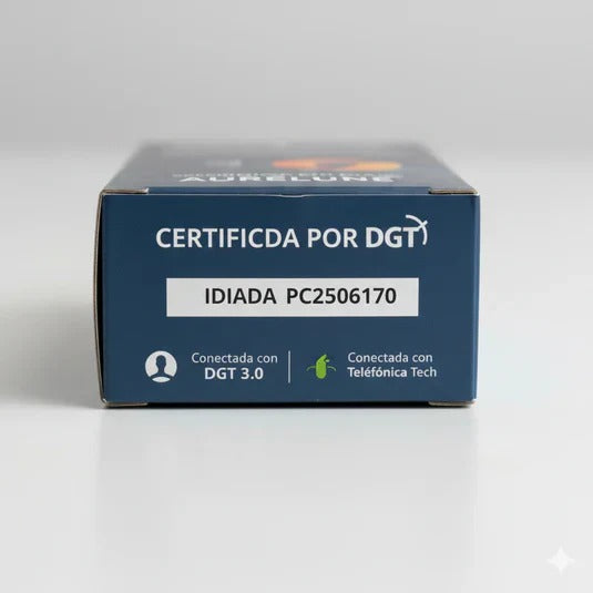 Sello oficial DGT + código IDIADA PC25060170. Certificado, aprobado en ITV, protección legal garantizada. Conectividad Telefónica Tech. Seguridad Real.